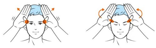 こめかみに親指を当て、目をつり上げるようにして押し上げます。
