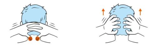 頭の後ろで手を組み、両方の親指を首の付け根に押し付けます。